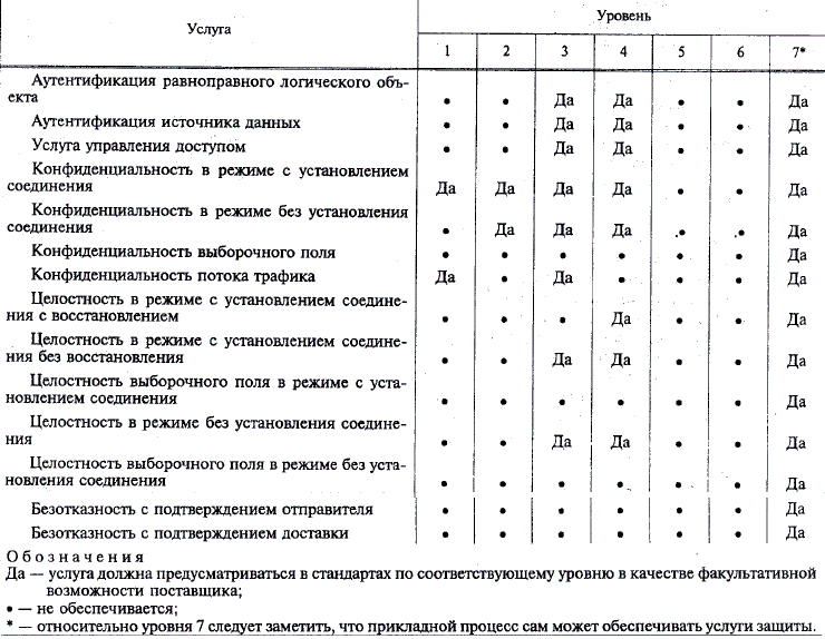 Уровень 5. Отсутствует, нет преимуществ относительно обеспечением этой услуги на уровнях от 4 до 7. Уровень 6. Отсутствует, однако механизмы шифрования могут поддерживать эту услугу на прикладном уровне.