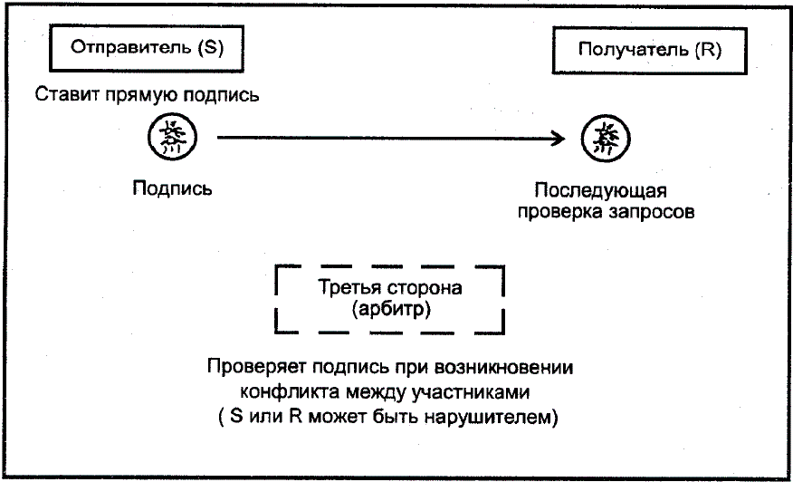 Из того следует, что использование доступной информации общего пользования возможно только для идентификации подписчика блока данных единственно в качестве лица, обладающего личным ключом. В случае возникновения последующего конфликта между участниками последнее означает возможность предоставить проверку идентификации подписчика блока данных надежной третьей стороне, которая привлекается при анализе аутентичности подписанного блока данных. Этот тип цифровой подписи называется схемой прямой подписи (см. рисунок 1). В других случаях может потребоваться дополнительное свойство (с):