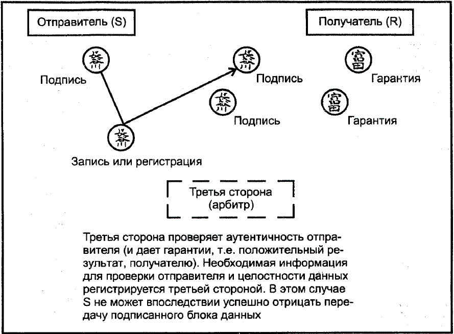 Надежная третья сторона (арбитр) обеспечивает получателю в этом случае источник и целостность информации. Этот тип цифровой подписи иногда называют схемой арбитражной подписи (см. рисунок 2).