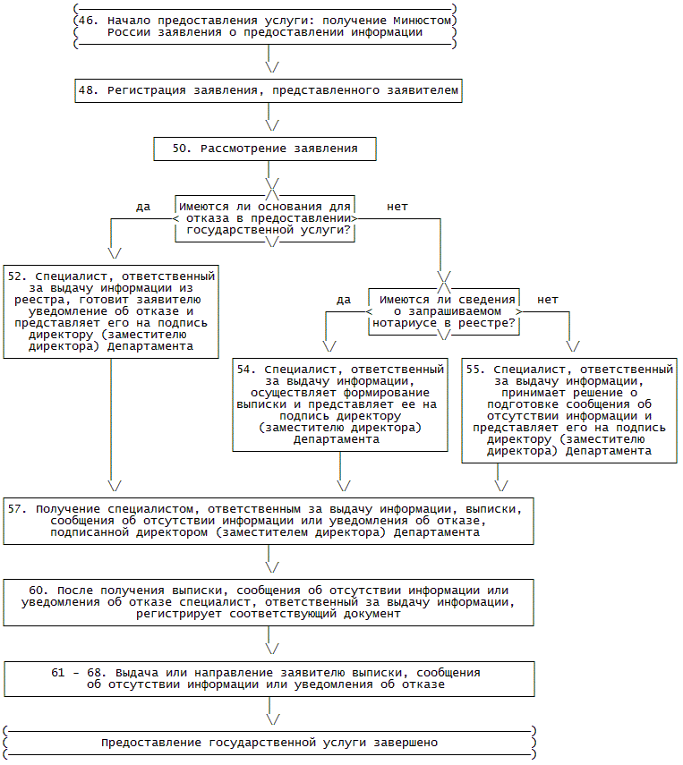 ПОСЛЕДОВАТЕЛЬНОСТИ ДЕЙСТВИЙ ПРИ ПРЕДОСТАВЛЕНИИ МИНИСТЕРСТВОМ ЮСТИЦИИ РОССИЙСКОЙ ФЕДЕРАЦИИ ГОСУДАРСТВЕННОЙ УСЛУГИ ПО ВЫДАЧЕ ФИЗИЧЕСКИМ И ЮРИДИЧЕСКИМ ЛИЦАМ ИНФОРМАЦИИ, СОДЕРЖАЩЕЙСЯ В РЕЕСТРЕ ГОСУДАРСТВЕННЫХ НОТАРИАЛЬНЫХ КОНТОР И КОНТОР НОТАРИУСОВ, ЗАНИМАЮЩИХСЯ ЧАСТНОЙ ПРАКТИКОЙ