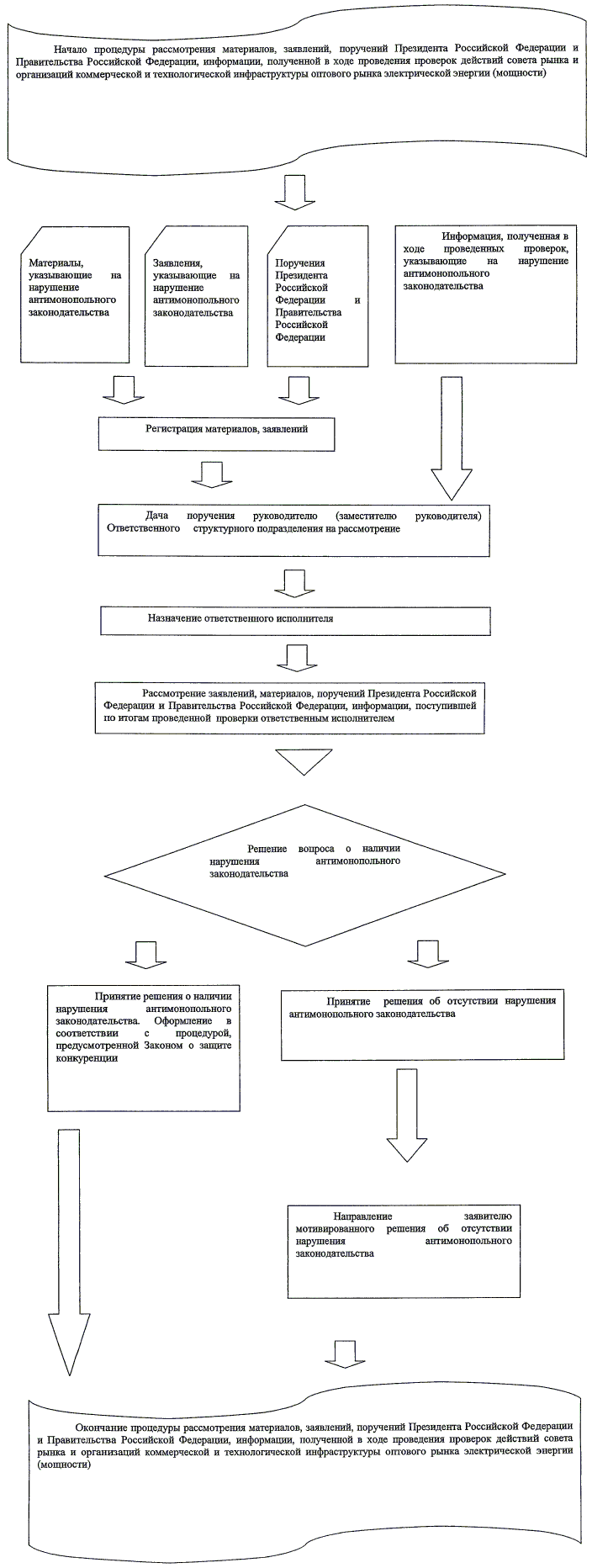 3.19. Заявление, материалы, указывающие на признаки нарушения антимонопольного законодательства Российской Федерации советом рынка и организациями коммерческой и технологической инфраструктуры оптового рынка электрической энергии (мощности), рассматриваются ФАС России независимо от места совершения нарушения либо места нахождения (жительства) лица, в отношении которого подается заявление, материалы.