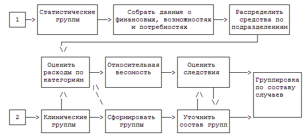 На первом этапе медицинские услуги объединяются в стандарт медицинской помощи (набор медицинских услуг), а цены на каждую из них позволяют просчитать стоимость стандарта по лечению конкретного заболевания. Разрабатываемые и устанавливаемые Министерством здравоохранения Российской Федерации стандарты медицинской помощи охватывают около 85% всех заболеваний. Поэтому всегда необходимо учитывать, что будут заболевания, пусть и не часто встречающиеся, на которые стандарты не разрабатываются, а при объединении заболеваний в группы их надо учитывать.