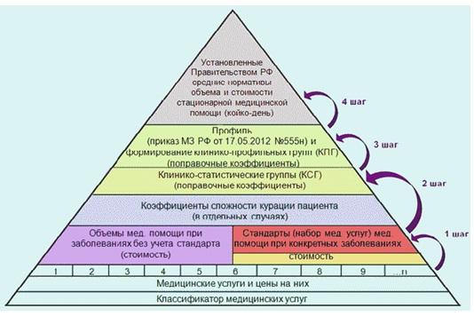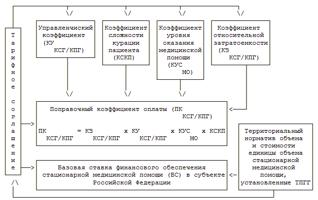 На втором этапе заболевания объединяются в КСГ и рассчитываются поправочные коэффициенты стоимости КСГ. В дальнейшем КСГ объединены в КПГ на основе профилей стационарной медицинской помощи и к ним установлены поправочные коэффициенты, как средневзвешенные показатели КСГ. За базовую ставку финансирования при этом принят норматив стоимости единицы стационарной медицинской помощи. По отношению к базовой ставке финансирования рассчитаны поправочные коэффициенты КСГ и КПГ. Субъект Российской Федерации для определения размера базовой ставки финансирования использует установленный ТПГГ территориальный норматив стоимости единицы объема и подушевой норматив финансового обеспечения стационарной медицинской помощи.