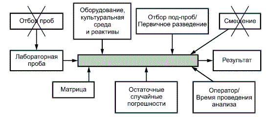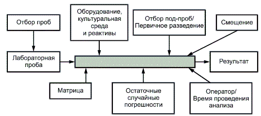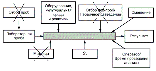 Глобальный подход может рассматриваться как реализация концепции "черный ящик", что иллюстрирует рисунок 1, где идентифицированы основные источники неопределенности измерений в пищевой микробиологии. Такая диаграмма может быть полезной при идентификации источников неопределенности при решении вопроса, относятся они или нет к данному конкретному случаю выбранного протокола проведения эксперимента.