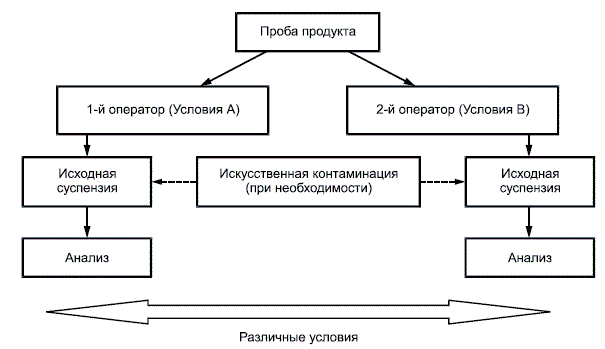 - словами "Условия 1" и "Условия 2" обозначены две группы условий испытаний, отличающиеся между собой настолько, насколько это возможно (разные операторы, разные партии культуральных сред, разные термостаты и пр.);