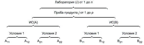 Необходимо отметить, что рисунок 2 настоящего стандарта, иллюстрирующий процедуру проведения экспериментальных исследований (см. 5.2.2), - это упрощенный вариант рисунка А.1: из всех результатов-повторностей, присутствующих на рисунке А.1, на рисунке 2 указаны только результаты-повторности А11 и В21.