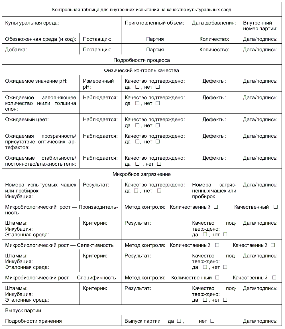 Надлежащее количество, в зависимости от размера партии культуральной среды, должно быть испытано на микробное загрязнение путем инкубации в соответствующих условиях. Намеченные пределы количества загрязненных чашек или емкостей жидкой среды следует установить для каждой среды, или они должны быть установлены производителем. Производители должны составить технические условия, основываясь на компонентах сред, технологических ограничениях и типе упаковки.