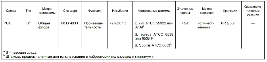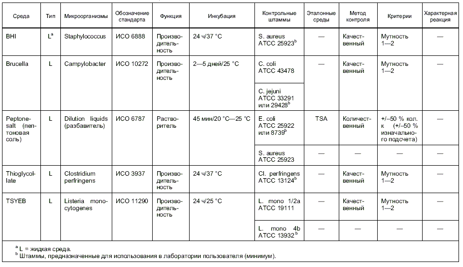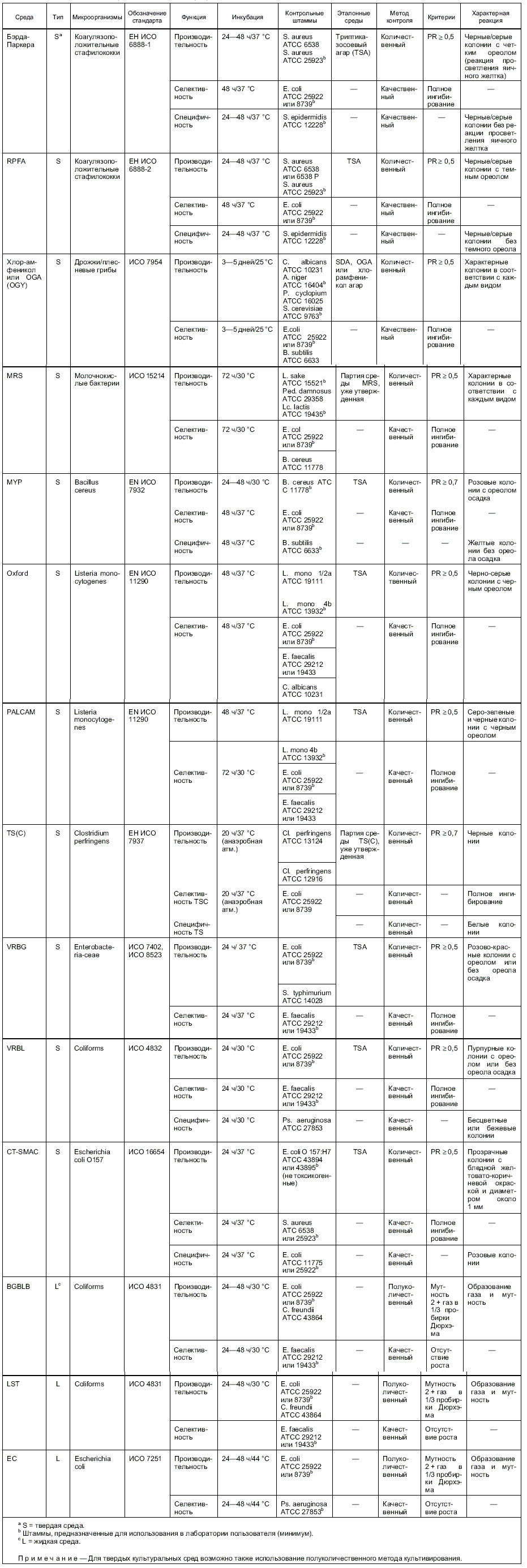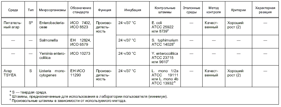 Таблицы B.1 - B.6 составлены, принимая во внимание контрольные штаммы, используемые в Европейской фармакопее, и рекомендации фармакопеи, касающиеся микробиологии пищевых продуктов в отношении культуральных сред (Рабочая группа Международного комитета по микробиологии пищевых продуктов и гигиене). Данные критерии предстоит включить в соответствующие стандарты при их подготовке или пересмотре в будущем (новый стандарт или пересмотр). Утвержденная партия среды - это партия среды, которая показала удовлетворительные эксплуатационные характеристики. Допускается использование тех же штаммов из других эталонных коллекций (например, NCTC, CIP и др.). Все приводимые среды описаны в стандартах ЕН и ИСО.