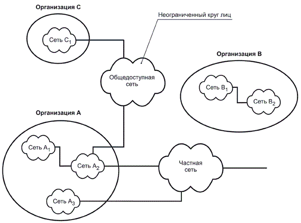 В современном мире информационные системы большинства коммерческих и государственных организаций связаны сетями (см. рисунок 1), при этом сетевые соединения могут относиться к следующим (одному или нескольким) видам: