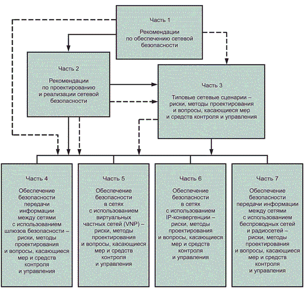 - знакомит с тем, как добиться высокого качества специализированных архитектур сетевой безопасности, а также с аспектами риска, проектирования, мер и средств контроля и управления, связанными с типичными сетевыми сценариями и областями сетевых "технологий" (которые детально рассматриваются в следующих частях ИСО/МЭК 27033);