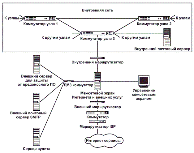 3.8. Демилитаризованная зона (demilitarized zone; DMZ); ДМЗ: пограничный сегмент сети (также известный как защищенная подсеть), выполняющий функции "нейтральной зоны" между сетями.