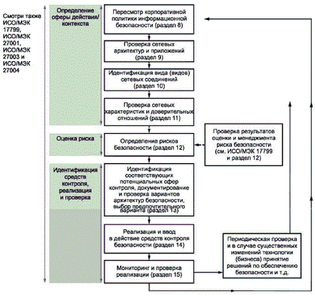После определения, документирования и согласования архитектуры технической безопасности и мер безопасности должны внедряться меры сетевой безопасности. Перед тем как разрешить начало операций по организации сети, должны быть проверены, обсуждены и протестированы любые выявленные недостатки безопасности (см. раздел 15). Затем после оценки состояния безопасности должны начинаться рабочие операции. По прошествии времени и в случае возникновения значительных изменений следует проводить дальнейшие проверки внедрения (см. раздел 15).