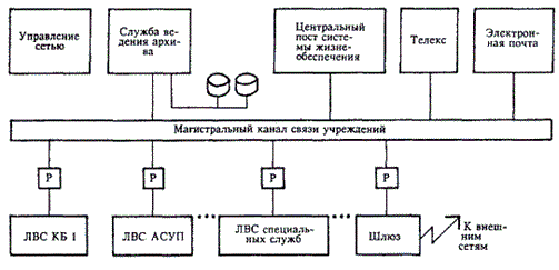 4.3. ЛВС верхнего уровня должна объединять системные службы, такие как Управление сетью, Архив, Телефакс и т.п., а также ЛВС подразделений и специальных служб (черт. 5).