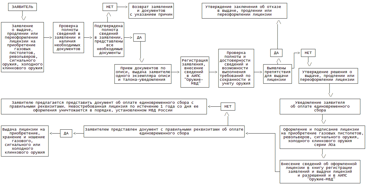 Уведомляем, что Ваше заявление о выдаче (продлении или переоформлении) лицензии на приобретение газовых пистолетов, револьверов, сигнального оружия, холодного клинкового оружия, предназначенного для ношения с национальными костюмами народов Российской Федерации или казачьей формой, рассмотрено.