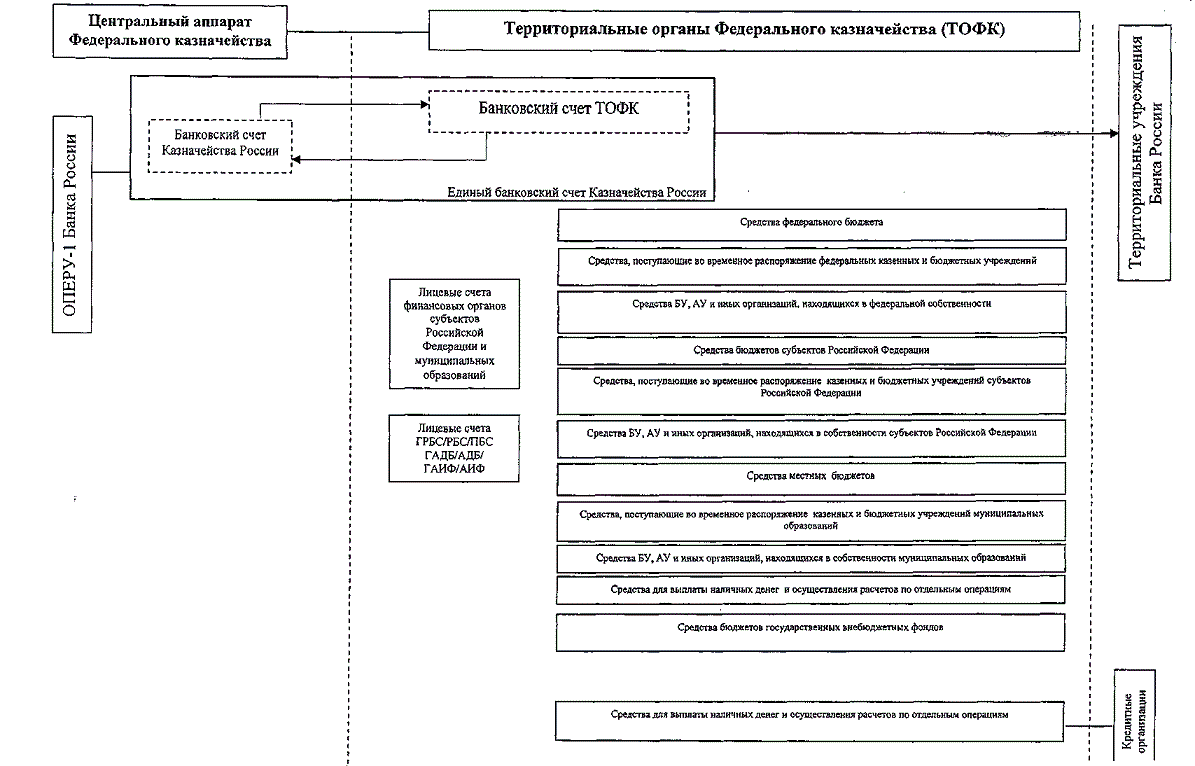 проведение Казначейством России операций по счетам бюджетов бюджетной системы Российской Федерации с участием Банка России в рамках многочисленных счетов (более 50 000 счетов), открытых Казначейству России и его территориальным органам (далее при совместном упоминании - Казначейство России) в Банке России. В настоящее время при осуществлении Казначейством России кассового обслуживания исполнения бюджетов бюджетной системы Российской Федерации, законодательство Российской Федерации не позволяет проводить операции распределения доходов бюджетов бюджетной системы Российской Федерации минуя счета Казначейства России по распределению доходов бюджетов, открытые в Банке России. В связи с этим, операции по лицевым счетам, открытым в территориальных органах Казначейства России, происходят одновременно с проведением аналогичных операций на счетах открытых Казначейству России в Банке России;