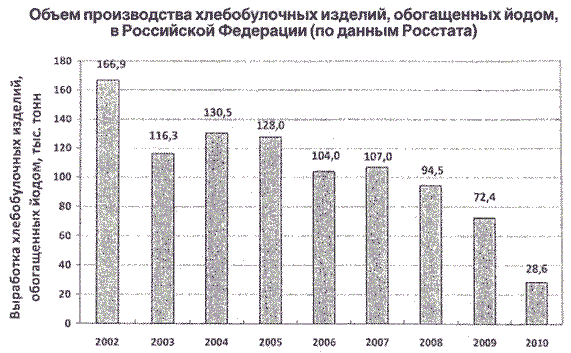 К концу 2010 года в нашей стране выпуск обогащенных витаминами и минеральными веществами хлебобулочных изделий составил около 2% от общего объема производства. Отмечается существенное снижение объемов производства хлебобулочных изделий, обогащенных йодом (рисунок 1).