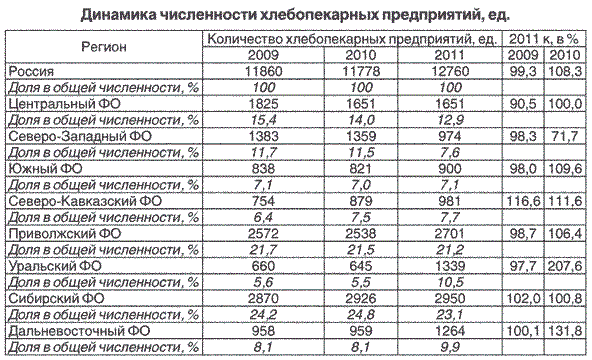 Общая численность хлебопекарных предприятий насчитывает 12 760 ед., из них 97,8% - малые и средние предприятия. По отношению к 2010 г. численность субъектов хлебопечении увеличилась на 8,3% (таблица 6).