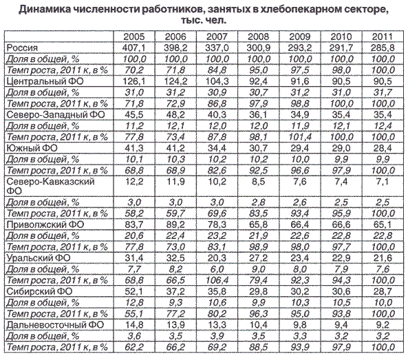 Общая численность сотрудников, занятых в хлебопекарном секторе составляет около 300 тыс. чел. По отношению к 2005 году уровень занятости сократился на 29,2%. Самое большое сокращение численности работников в СФО - на 44,9% (таблица 8).