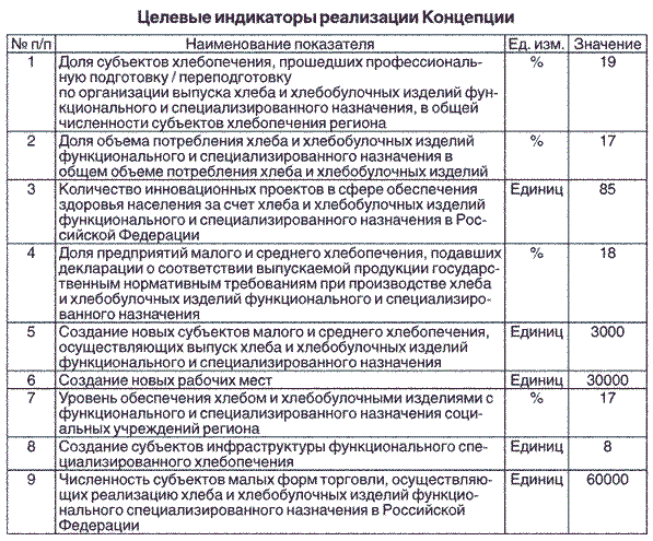 Ожидаемые результаты реализации мероприятий Концепции к 2020 году будут оцениваться по целевым индикаторам, характеризующим состояние функционального и специализированного хлебопечения (таблица 9).