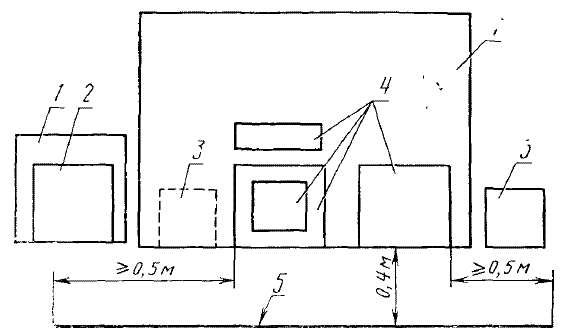 1 - стол; 2 - измеритель радиопомех; 3 - эквивалент сети; 4 - ТС, входящие в состав испытуемого устройства; 5 - металлический лист
