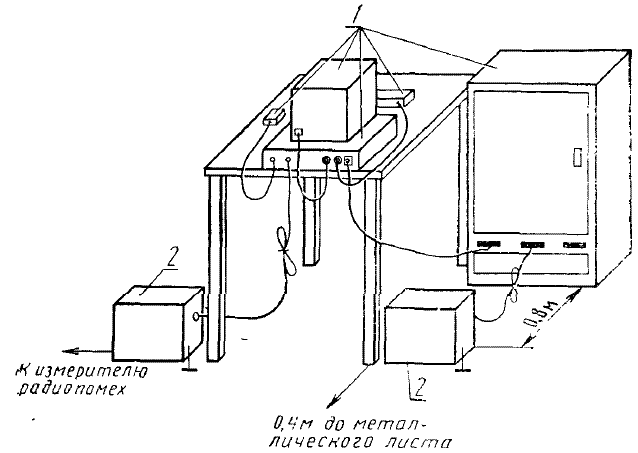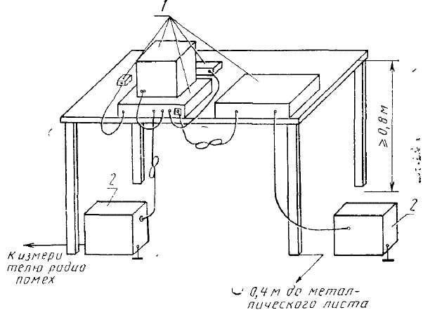 1 - стол; 2 - измеритель радиопомех; 3 - ТС, входящие в состав испытуемого устройства; 4 - металлический лист; 5 - эквивалент сети