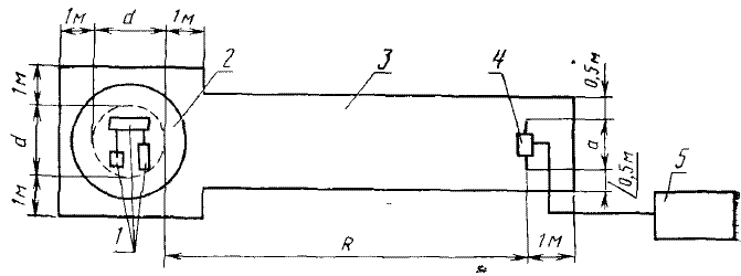 1 - испытуемое устройство; 2 - поворотная платформа; 3 - поверхность площадки, покрытая металлическими листами; 4 - измерительная антенна; 5 - измеритель радиопомех, d - максимальный размер испытуемого устройства; R - расстояние от испытуемого устройства до антенны; а - максимальная длина антенны