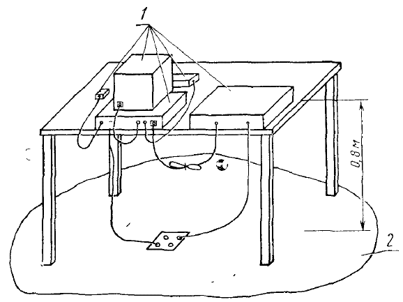 Настольные ТС располагают вдоль края стола, отодвинутого на 0,4 м от установленного вертикально металлического листа. Соединительные кабели оставляют свободно провисающими вдоль края стола. Если кабель провисает настолько, что от него до горизонтально расположенного па полу металлического листа остается менее 0,4 м, то его сворачивают, как указано в п. 3.1.14.