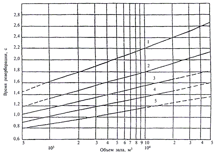 Оптимальные значения времени реверберации в области средних частот 500-1000 Гц для залов различного назначения в зависимости от их объема приведены на рисунке 6. Допустимое отклонение от приведенных величин - 10%. Кроме того, в октавной полосе 125 Гц допускается превышение величин времени реверберации, но не более 20%.