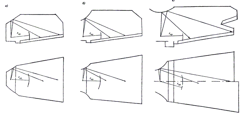 На рисунке 9 приведены три варианта проектного решения купола. Вариант а иллюстрирует крайне неудачное решение, радиус кривизны купола примерно равен высоте зала, звук фокусируется в центре зала. Вариант б - радиус кривизны составляет половину высоты зала, отражения проходят через точку фокуса и далее распределяются по площади пола. Вариант в - радиус кривизны составляет примерно две высоты зала. Звук отражается от купола в виде пучка параллельных лучей.