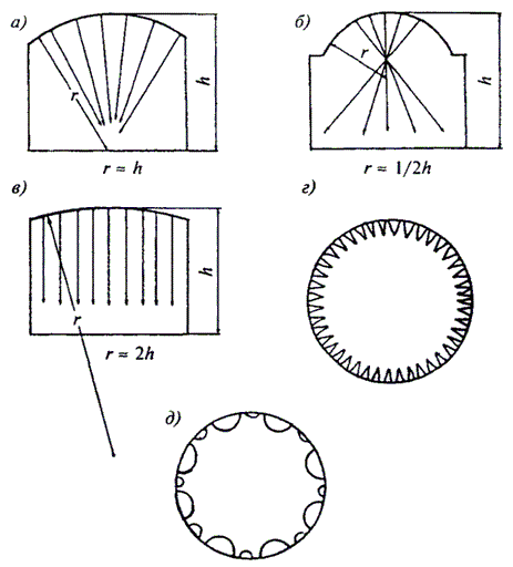 Если форму купола изменить невозможно (например, здание цирка) для избежания фокусирования звука следует применить членение поверхности купола (рисунки 9, г и 9, д) или использовать облицовку купола звукопоглощающими материалами.