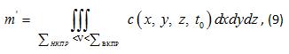 _НКПР - поверхности в пространстве достижения соответственно верхнего и нижнего концентрационных пределов, c(x, y, z, t_0) - распределение концентрации в момент времени t_0, кг/м3; t_0 - момент времени воспламенения или момент времени, когда во взрывоопасных пределах находится максимальное количество топлива, с.