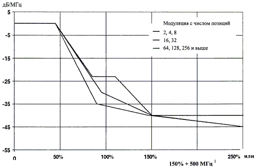3.15. Маска спектра излучаемого сигнала для оборудования с 64-позиционной модуляцией для диапазонов частот от 2 до 11 ГГц со скоростью передачи 2 x 155 Мбит/с (режим "co-channel") с шагом сетки частот 40 МГц приведена на рисунке 14.
