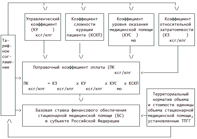 Поправочный коэффициент оплаты КСГ или КПГ для конкретного случая рассчитывается с учетом коэффициентов оплаты, установленных в субъекте Российской Федерации по следующей формуле:
