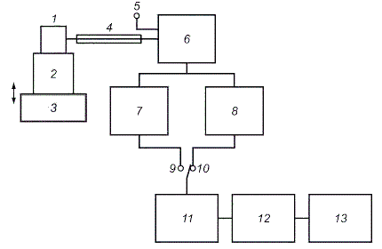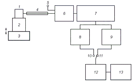 1 - датчик вибрации; 2 - система крепления; 3 - вибрирующая поверхность; 4 - кабель; 5 - электрический вход; 6 - согласование сигнала; 7 - полосовая фильтрация; 8 - частотная коррекция (включая полосовую фильтрацию); 9 - отфильтрованный сигнал; 10 - корректированный сигнал; 11 - временное взвешивание сигнала; 12 - дополнительное преобразование; 13 - показывающее устройство