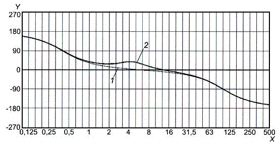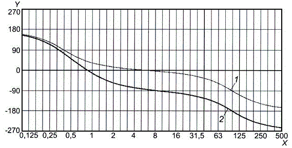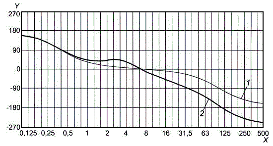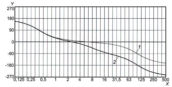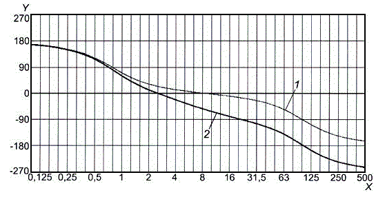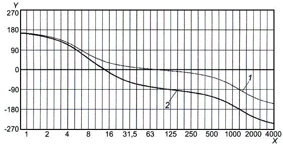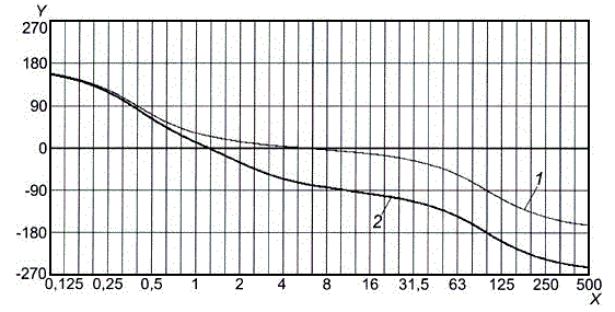 j) сгладить полученные выборочные значения непрерывной кривой, зафиксировав первую точку сформированной общей последовательности [значение запаздывания по фазе для основного тона низшей частоты первой последовательности, полученной в результате выполнения шага f)] и подбирая соответствующим образом значения запаздывания по фазе для основных тонов низшей частоты других четырех последовательностей [полученных в результате выполнения шага h)], например с помощью рекуррентной процедуры или графическим методом. Тогда экспериментально полученная зависимость запаздывания по фазе от частоты будет определена с точностью до некоторого постоянного слагаемого;