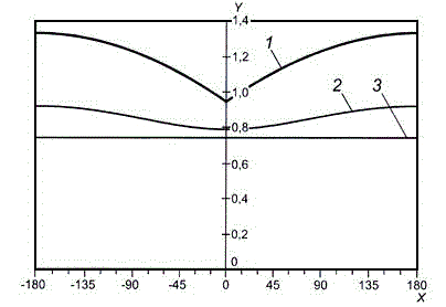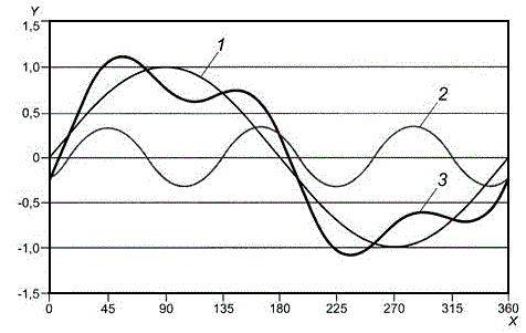 X - фаза основного тона, ...°; Y - значение сигнала; 1 - основной тон; 2 - гармоника (начальная фаза сдвинута на 15°); 3 - результирующий сигнал