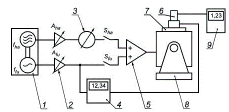 1 - генератор двухканального сигнала с контролируемым сдвигом фаз; 2 - усилитель с регулируемым коэффициентом усиления; 3 - фазовращатель; 4 - фазометр; 5 - сумматор с усилителем мощности; 6 - датчик вибрации испытуемого средства измерений; 7 - эталонный акселерометр; 8 - вибростенд; 9 - измерительный блок испытуемого средства измерений