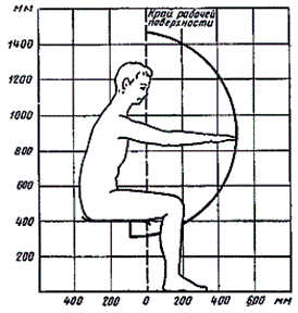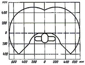 2.1. Конструкцией рабочего места должно быть обеспечено выполнение трудовых операций в пределах зоны досягаемости моторного поля. Зоны досягаемости моторного поля в вертикальной и горизонтальной плоскостях для средних размеров тела человека приведены на черт. 1 и 2.