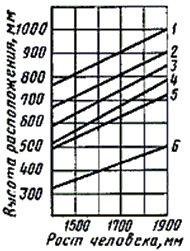 высоты сиденья и подставки для ног (при нерегулируемой высоте рабочей поверхности). В этом случае высоту рабочей поверхности устанавливают по номограмме (черт. 4) для работающего ростом 1800 мм. Оптимальная рабочая поза для работающих более низкого роста достигается за счет увеличения высоты рабочего сиденья и подставки для ног на величину, равную разности между высотой рабочей поверхности для работающего ростом 1800 мм и высотой рабочей поверхности, оптимальной для роста данного работающего.