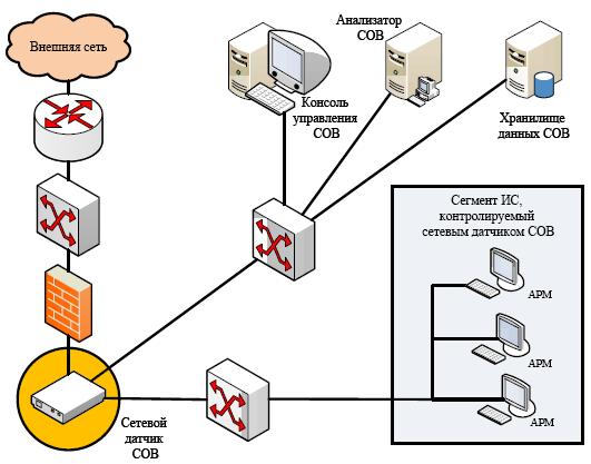 Датчики (сенсоры) собирают информацию о пакетах данных, передаваемых в пределах информационной системы (ИС) (сегмента ИС), в которой (котором) установлены эти датчики. Датчики СОВ уровня сети могут быть реализованы в виде программного обеспечения (ПО), устанавливаемого на стандартные программно- технические платформы, а также в виде программно-технических устройств, подключаемых к ИС (сегменту ИС). Анализаторы выполняют анализ собранной датчиками информации, генерируют отчеты по результатам анализа и управляют процессами реагирования на выявленные вторжения.