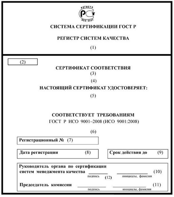 Прямоугольные поля на формате сертификата соответствия СМК (далее - сертификат), обозначенные цифрами в скобках, носят условный характер и должны содержать следующие данные: