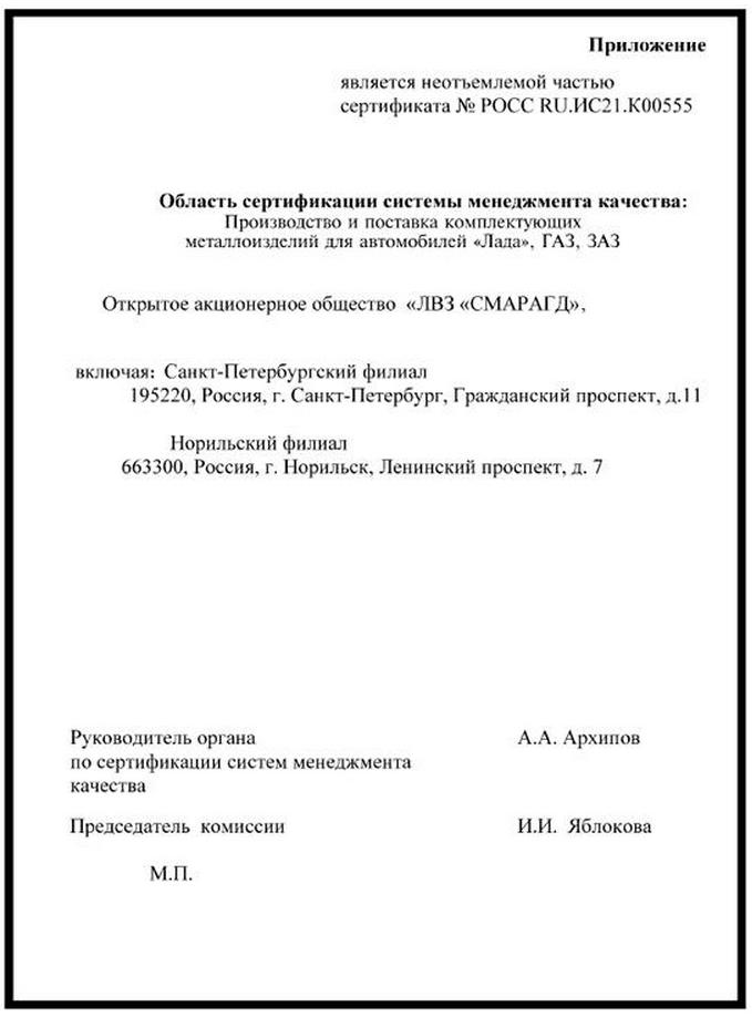 При сертификации СМК организаций, имеющих более одной производственной площадки, наименования и юридические адреса этих площадок указывают в приложении к сертификату;