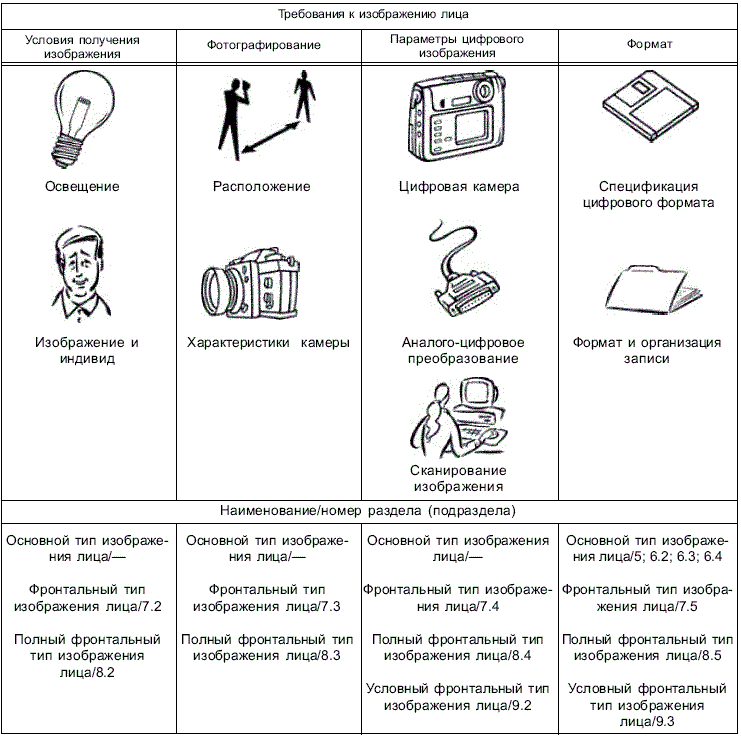 Требования к условиям получения изображения, фотографированию, параметрам цифровых изображений и форматам для указанных в настоящем стандарте типов изображения лица представлены на рисунке 1.