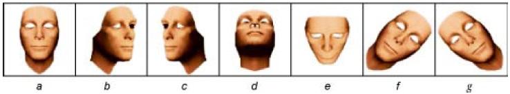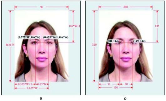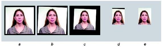 На рисунке 15 приведен пример последовательности этапов, которые могут быть необходимы для преобразования изображения лица к условному фронтальному типу. В процессе создания изображения условного фронтального типа с горизонтальным размером 240 пикселей исходное изображение (а) вращается так, чтобы выровнять положение глаз по горизонтали (b). Далее изображение масштабируют таким образом, чтобы расстояние между центрами глаз было точно равно 60 пикселям (с). После этого изображение форматируют и обрезают (d) так, чтобы координаты первого глаза были равны (89, 144), то есть 89 пикселей по горизонтали и 144 пикселя по вертикали при отсчете от верхнего левого угла изображения, имеющего координаты 0,0. Черным пикселям, заполняющим поля изображения, может быть присвоено любое значение цвета, но при этом рекомендуется, чтобы он совпадал с цветом пикселей, лежащих на границе исходного изображения (е).