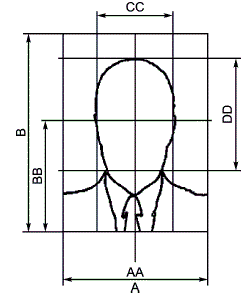 Для изображения лица полного фронтального типа отношение горизонтальный размер изображения: горизонтальный размер головы (А:СС) должно быть в диапазоне от 7:5 до 2:1, что соответствует требованиям большего числа агентств по выдаче водительских удостоверений и международных паспортов.