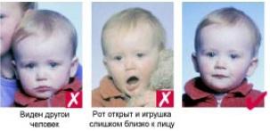 Для детей (обычно моложе 11 лет) допускается меньший относительный размер головы (до 50 % области изображения), если это необходимо для обеспечения качества фотографического изображения, например, устранения искажений типа бочкообразной дисторсии (4.11) или размывания границ.