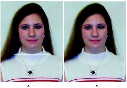 Приведенные выше результаты анализа показывают, что степень сжатия 60:1 с использованием формата JPEG2000 сохраняет высокую вероятность правильного совпадения. Если для внутренней области использовать отношение сжатия 50:1, то для внешней области может использоваться отношение 200:1, при котором сохраняется достаточное для визуального анализа качество изображения. Для цветного изображения в формате JPEG2000 с разрешением 300 dpi, размером 35 х 45 мм (413 х531 пикселей, 658 Кб в несжатом виде), с размером внутренней области 240 х 320 пикселей (230,4 Кб) как показано на рисунке 14: