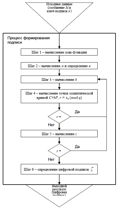 3.1.9 процесс формирования подписи (signature process): Процесс, в качестве исходных данных которого используются сообщение, ключ подписи и параметры схемы ЭЦП, а в результате формируется цифровая подпись.