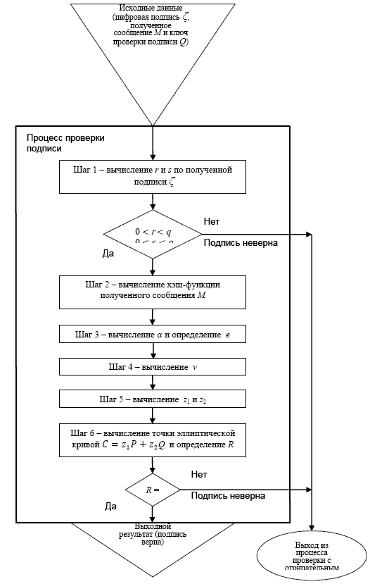 3.1.8 процесс проверки подписи (verification process): Процесс, в качестве исходных данных которого используются подписанное сообщение, ключ проверки подписи и параметры схемы ЭЦП, результатом которого является заключение о правильности или ошибочности цифровой подписи.