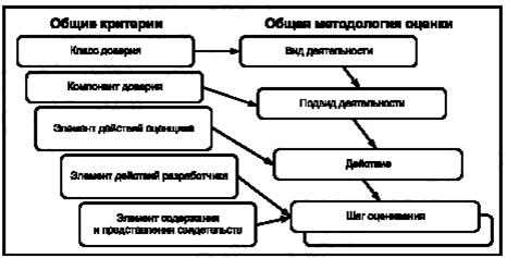 Имеется прямая взаимосвязь между структурой ИСО/МЭК 15408 (класс-семейство-компонент-элемент) и структурой настоящего стандарта. Рисунок 1 иллюстрирует соответствие между такими конструкциями ИСО/МЭК 15408, как классы, компоненты и элементы действий оценщика, и рассматриваемыми в методологии оценки видами деятельности, подвидами деятельности и действиями. Некоторые шаги оценивания из методологии оценки могут следовать из требований ИСО/МЭК 15408, содержащихся в элементах действий разработчика или элементах содержания и представления свидетельств.